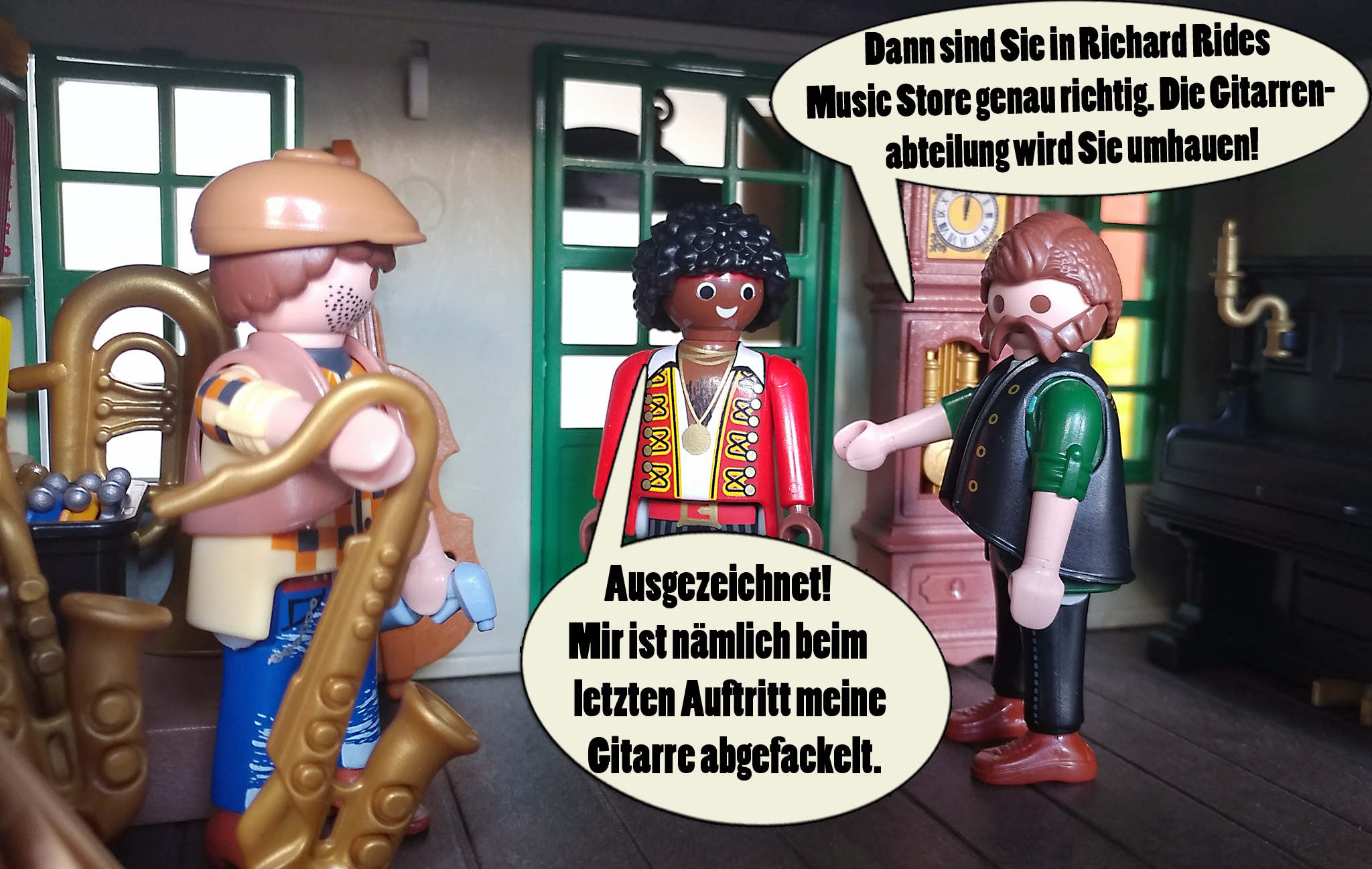 RE: The Music StoreY - Crash - 22.05.2022 Danke Euch für das positive Feedback zum Prolog. @Floranja89: Jimmy Crash ist einer meiner Alter Egos, und klar, der Name ist eine Hommage an Johnny Cash. Da ich selbst aber Rocknroll spiele (und nicht Country), ist das beim Playmo-Crash auch so. Nun aber: Folge 1: Der erste Kunde RE: The Music StoreY - Crash - 22.05.2022 RE: The Music StoreY - deskoenigsadmiral - 22.05.2022 Der Besitzer gefällt mir, der kann auf Sizilien, in der Römerwelt bei Ralfus Kochus auch ein Geschäft eröffnen, die passen zueinander..... ![]()