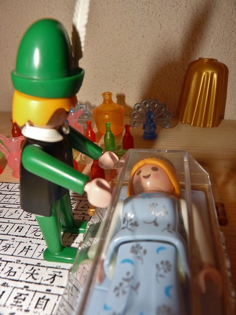 Der Schneider gehorchte ohne Zaudern, alsbald hob sie den Glasdeckel in die Höhe, stieg heraus und eilte in die Ecke des Saals, wo sie sich in einen weiten Mantel verhüllte.