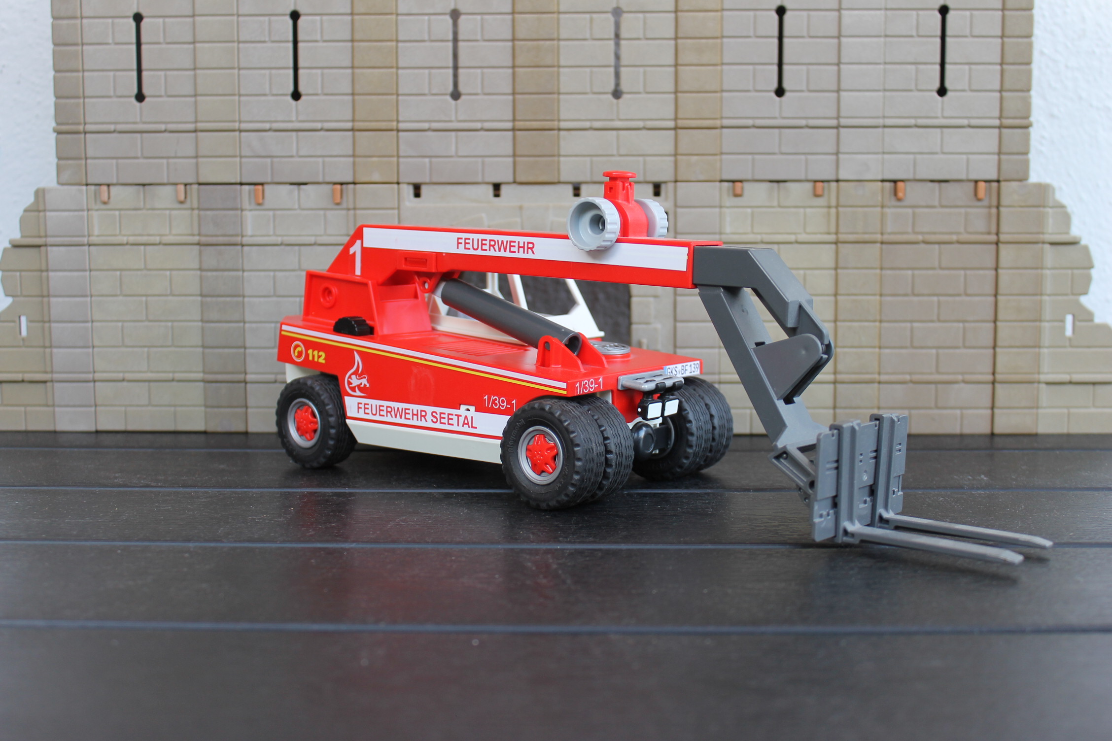 Für den Umschlag und zur logistischen Unterstützung hat die BF einen Telelader. Dieser ist lediglich mit einer Palettengabel ausgestattet, kann aber die Anbaugeräte des THW aufnehmen.