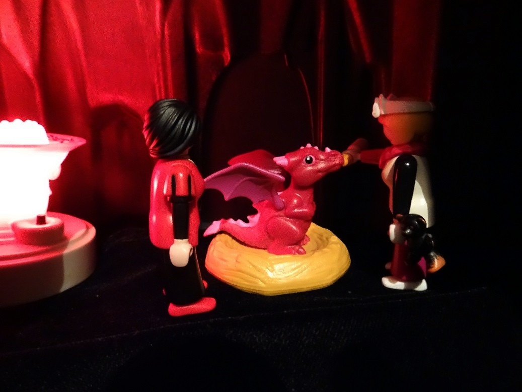 Dracarissa: „Weißt Du, Rubindrachen bekommen immer nur Nachwuchs, wenn ihr menschlicher Partner stirbt. Dann verlassen sie ihr Dorf und suchen, bis sie auf einen anderen Rubindrachen treffen. Das habe ich auch. Nur dass ich meine Leute nicht verlassen werde, jetzt wo Draculina geschlüpft ist.“