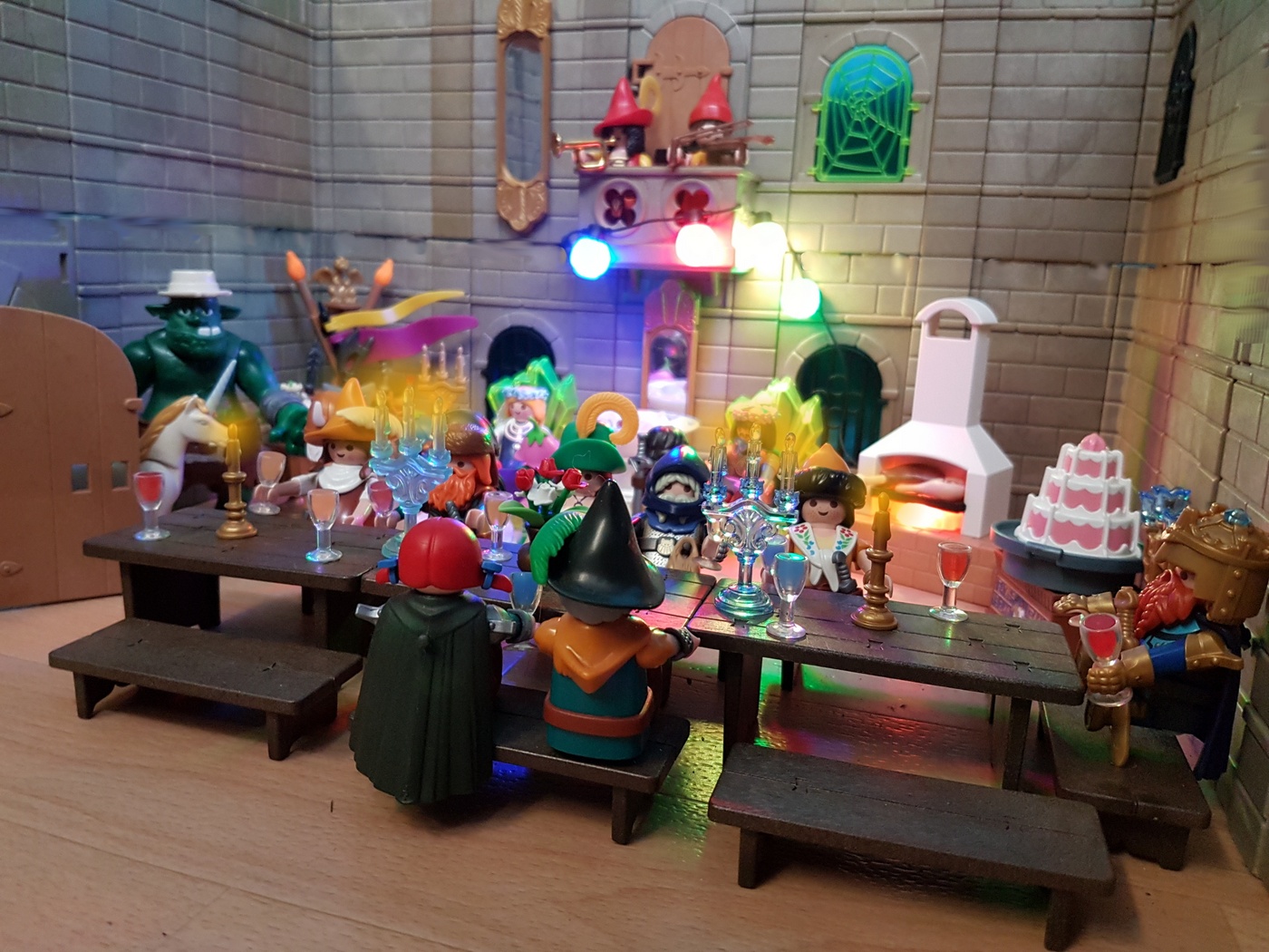 Nachdem sie dem Brautpaar ihre Glückwünsche vorgetragen haben, setzen sich die Gäste an die lange Tafel zum Zwergenkönig. Hier werden sie mit Wein versorgt und warten auf das Essen, das bald kommen soll.
