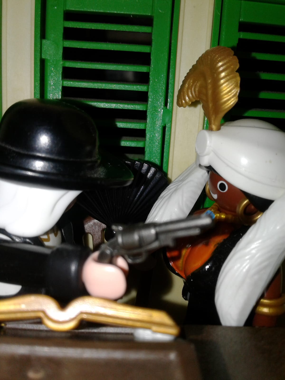OK, Roy..... ich bin immer nett..... aber wenn du meinem Süßen auch nur ein Haar krümst....... dann erzähle ich allen..... flüster.... Santa Anna..... flüster..... Gold beim....... flüster....... das du....... flüster.... für Spanien..... flüster....... Geheimnisverrat....... flüster...... flüster........ mit der First Lady........ flüster, flüster.....