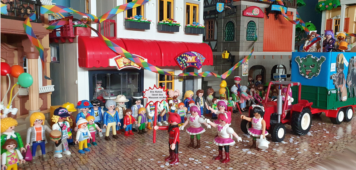 Anna: "Mit der nächsten Gruppe wird's allerdings politisch. Die Playmohausener Katzenmusik ist nicht nur für ihre akrobatischen Tänze, sondern auch für ihre Mottowägen bekannt."