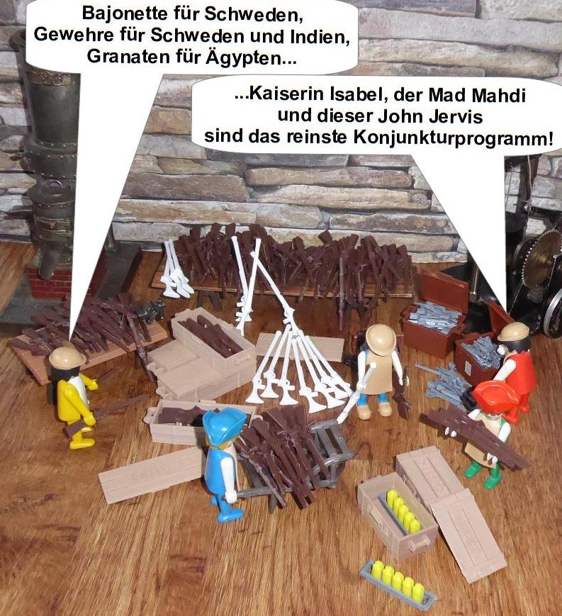 Jetzt meint Kaiserin Isabel, sie müßte auch Truppen auf Hiddensee stationieren. König Erik von Schweden droht ihr, ihre Schiffe in Grund zu bohren, wenn sie versuchen, den Öresund zu passieren. Ministerpräsident Davis droht Spanien mit einem Angriff auf Neuspanien, wenn sich Spanien mit Schweden anlegt. Der Tipu Sultan droht Spanien, König Ottokar verbündet sich mit Kaiserin Isabel; Napoleon bedroht beide, Österreich bedroht König Ottokar, und das ist vermutlich noch nicht alles... Und ehe wir uns versehen, haben wir einen Weltkrieg! Das war es dann mit Frieden, Handel und Wohlstand - und mit unseren Flitterwochen!