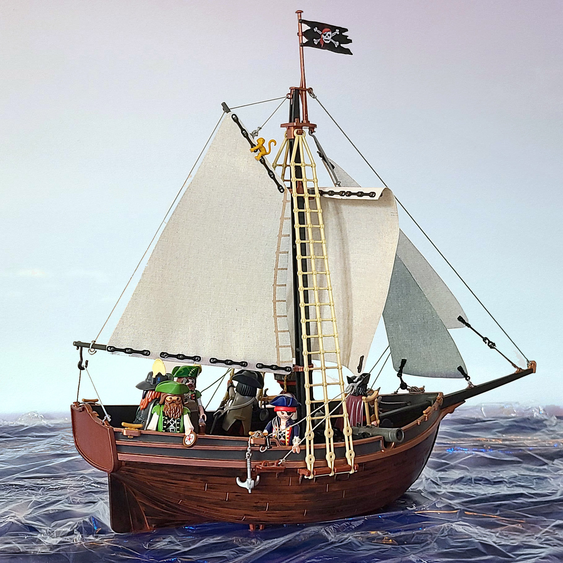 Die beiden Kanonen an Bord (je eine steuerbord, eine backbord) sind hingegen allein zu Abschreckungszwecken gedacht. Es wäre ja bescheuert, ein potentielles Beuteschiff zu versenken, bevor man eine Prise gemacht hat. Aber wenn sich die Bukaniere einmal verteidigen müssen, ist es natürlich immer gut, einen kleinen runden Gruß per Luftpost raushauen zu können. Hoffentlich zündet das durchweichte Schießpluver noch, wenn es eines Tages darauf ankommen sollte...