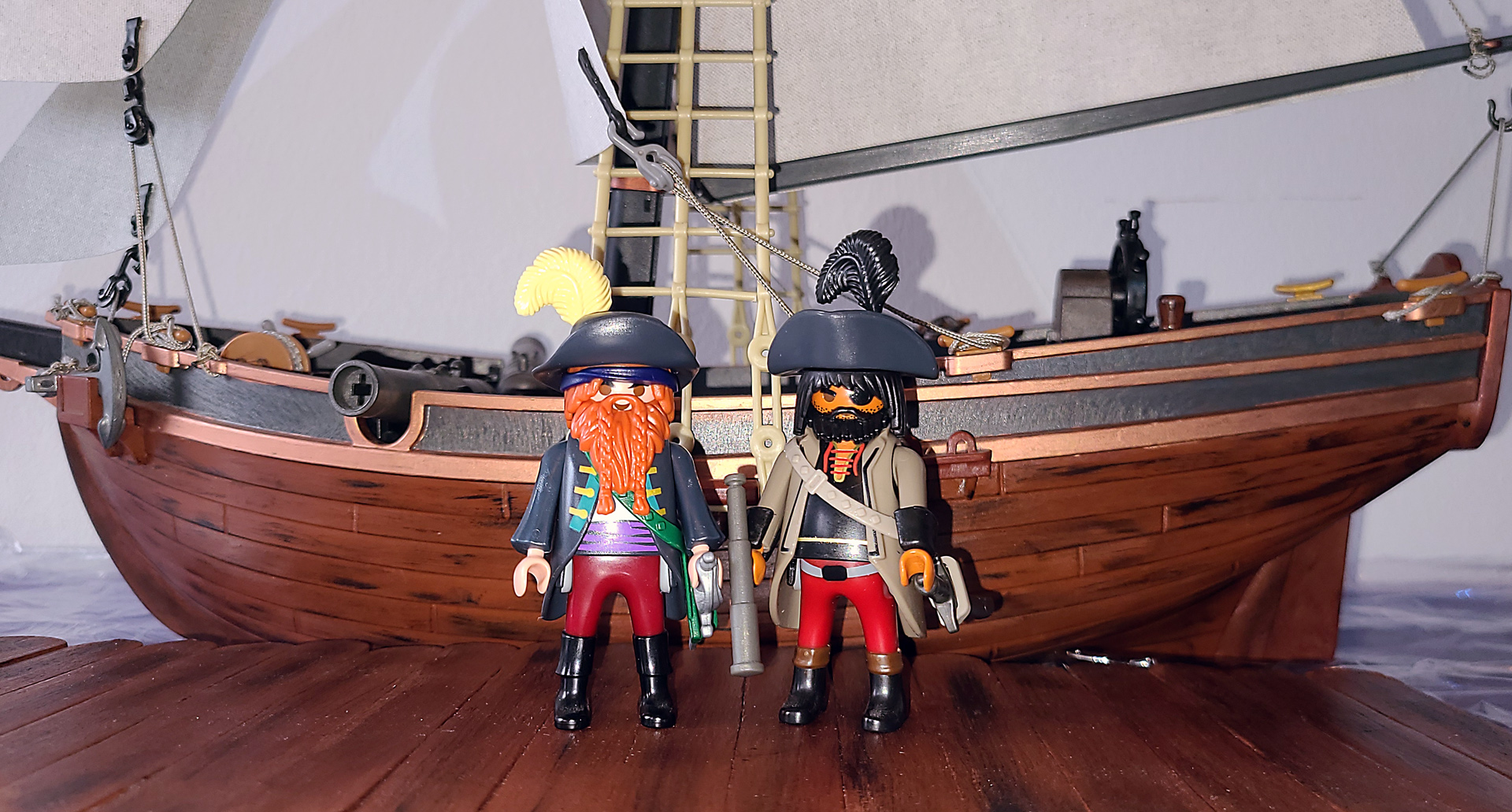 In den Kisten lagert Playmobil, eigentlich haben die nichts mit den Schiffen zu tun sondern dienten nur als Sockel