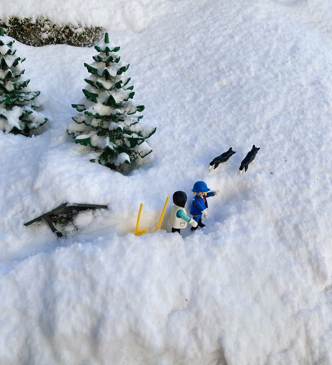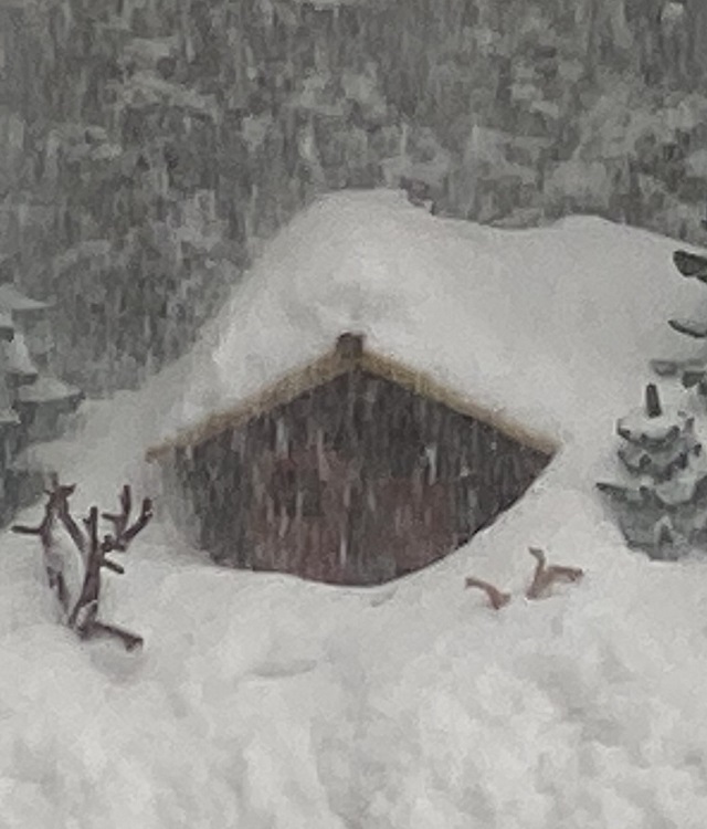 Da standen sie nun auf ihrer Terrasse, schlugen die Hände über dem Kopf zusammen und konnten es nicht fassen. Die kleineren Bäume waren zum Teil komplett im Schnee versunken, auch von der Futterkrippe war fast nichts mehr zu sehen. Soviel Schnee hatten sie ihr Lebtag noch nicht gesehen.