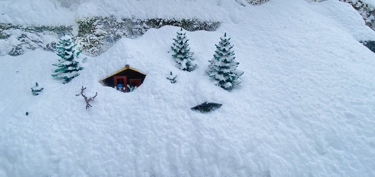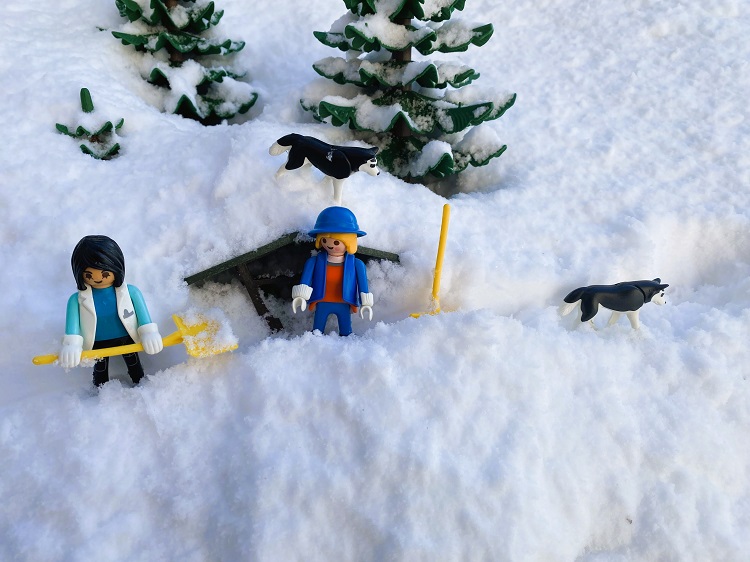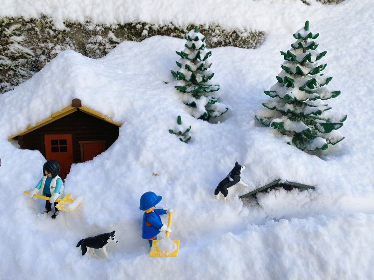 Am Nachmittag war es wärmer geworden und Fanny meinte: „Vielleicht sollten wir jetzt doch mal Schnee schieben. Wir sehen ja kaum den Himmel.“ Fredeswind stimmte seufzend zu: „Mh, da wird uns wohl nichts anderes übrigbleiben. Also lass uns mit Ausbuddeln anfangen.“ Nach einer deftigen Brotzeit packten sie die Schneeschaufeln und legten los.