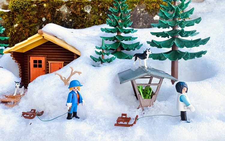 Ohne direkten Vorsatz habe ich die Hütte mit Bäumen, Tieren und Futterkrippe hinausgestellt, als es zu schneien anfing, um zu sehen, was passiert. Es stand alles nur auf einer bemoosten Steinbank etwa 2 m unterhalb des Hofes im Garten. Im Laufe des Tages habe ich mehrere Fotos gemacht. Am nächsten Morgen lagen um die 15 cm Schnee auf dem Hof. Das Schneefräsenunwetter meines Sohnes am nächsten Morgen, hat das tiefe Einschneien verursacht. Ich bekam einen ganz schönen Schrecken, als ich aus meinem Fenster des Playmobilzimmers schaute und in dem Moment sah, wie die erste Ladung Schnee der Fräse direkt auf der Szenerie landete. Das hielt ich bei der nächsten dann mit meiner Handykamera fest (Schneesturm). Das Dio nahm, Dank des Pulverschnees, keinen Schaden. Hätte auch ins Auge gehen können. Das war ein genialer Zufall, dass der Schneewurf ausgerechnet so im Garten landete. Dann habe ich angefangen nach und nach ein paar Szenen zu fotografieren. Die ersten Fotos hatte ich zufällig einige Wochen zuvor gemacht. Nachdem ich für sie noch keinen Verwendungszweck hatte, konnte ich sie nun als Übergang benutzen. Schließlich brauchte ich noch eine Schlussszene, die habe ich dann auf einem läppischen Schneerest vor dem Stein fotografiert, der unseren Brunnen begrenzt.