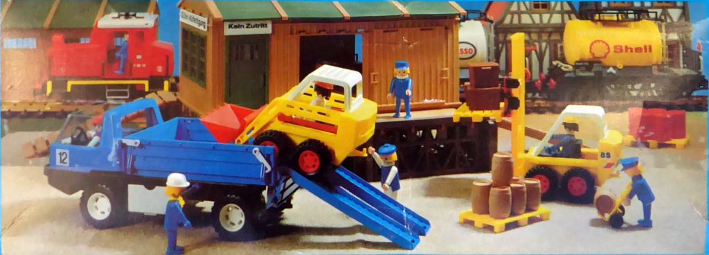 Auch auf der Schachtel vom alten Gabelstapler 3506 ist eine Baustelle abgebildet, und 2 Szenen von Verladevorgängen: