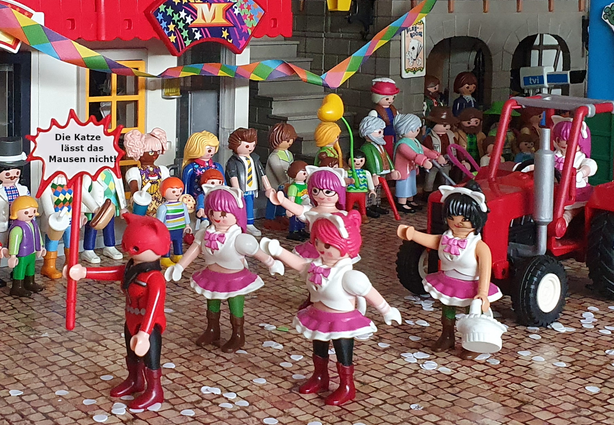 Anna: "Mit der nächsten Gruppe wird's allerdings politisch. Die Playmohausener Katzenmusik ist nicht nur für ihre akrobatischen Tänze, sondern auch für ihre Mottowägen bekannt."