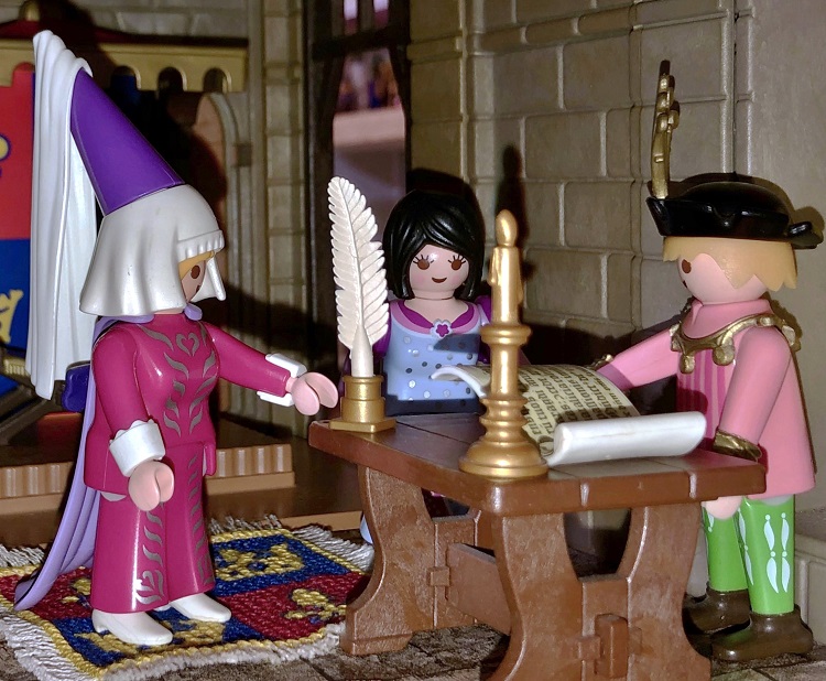 Sie betraten als erstes den Thronsaal, der sich direkt an den Speisesaal anschloss. Hier erwartete sie Gerwulf der Burgchronist. Er begrüßte die beiden fröhlich und sprach zu Fanny: „Herzlich Willkommen auf Burg Adlerhorst. Was bin ich froh, dass Ihr gut eingetroffen seid! Was ist Euch denn widerfahren, dass Ihr so verspätet hier angekommen seid.“ Fanny erzählte kurz von den Erlebnissen ihrer Reise, was der Chronist auch sofort niederschrieb. Er lud Fanny noch ein doch bei ihm vorbeizuschauen, er wolle sie unbedingt seiner Familie vorstellen.