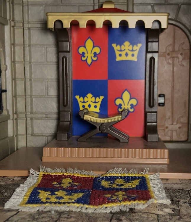 Dann erst hatte sie Zeit sich genauer umzuschauen Der Thronsaal war ausgesprochen schlicht gehalten. Darüber war Fanny sehr erstaunt, sie hatte sich einen Thronsaal prächtiger vorgestellt. Das wertvollste schien hier, nach ihrem Ermessen, der Teppich zu sein. Die ausgesprochen schönen Teppiche in der Burg waren ihr schon die ganze Zeit aufgefallen, egal ob in der Kemenate mit dem Schlafzimmer oder dem Burgfried. Fanny erkundigte sich: „Sag mal, diese wundervollen Teppiche hier in deiner Burg, wer knüpft diese denn?“ Fredeswind antwortete: „Rabigaud, unser Händler hat da Beziehungen, er braucht bloß einen Entwurf, den er dann ausführen lässt. Die Entwürfe sind übrigens von mir, nach alten Wappen oder Mustern.“ Fanny staunte nicht schlecht.