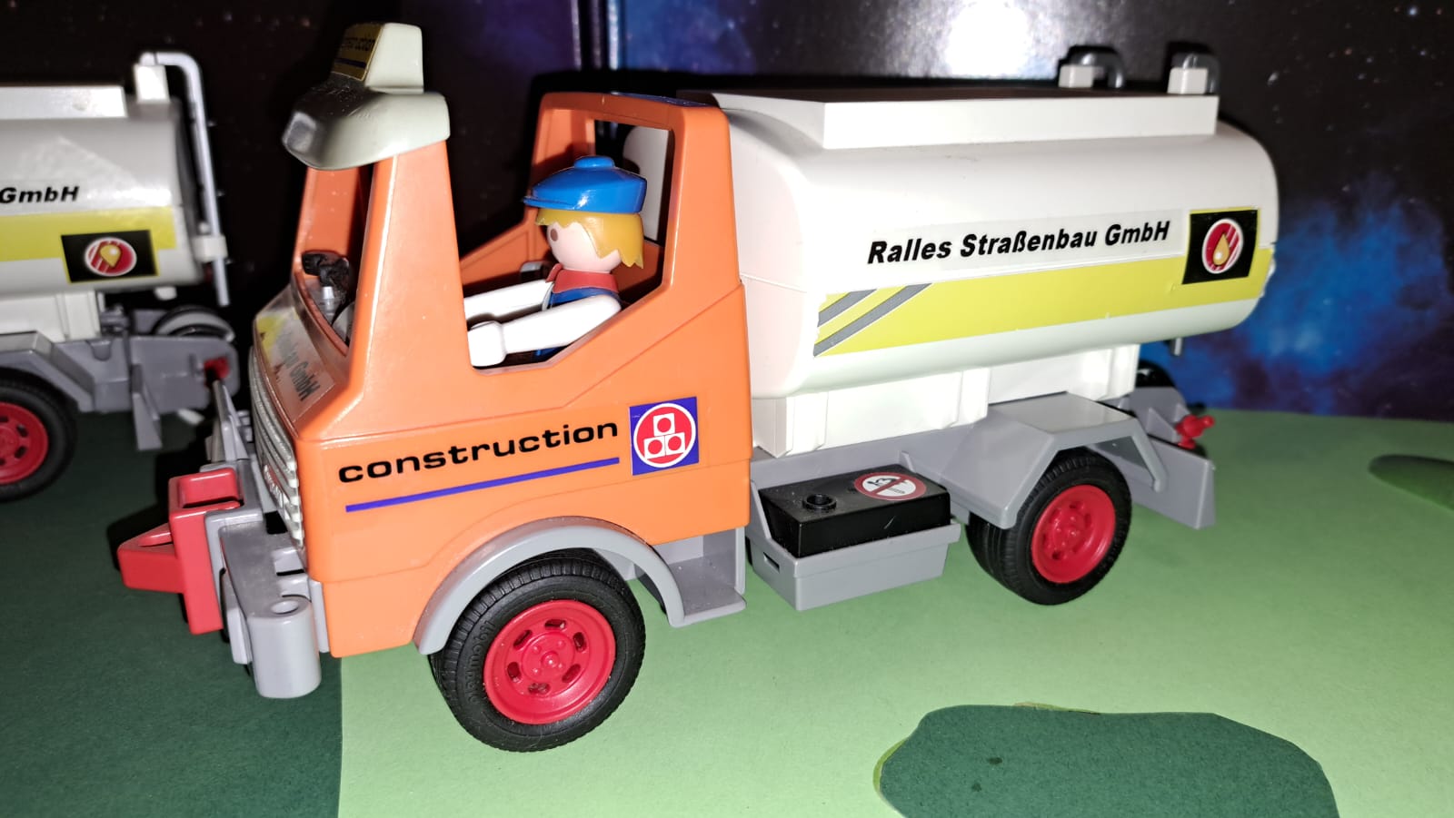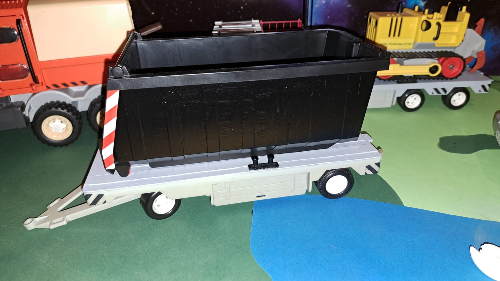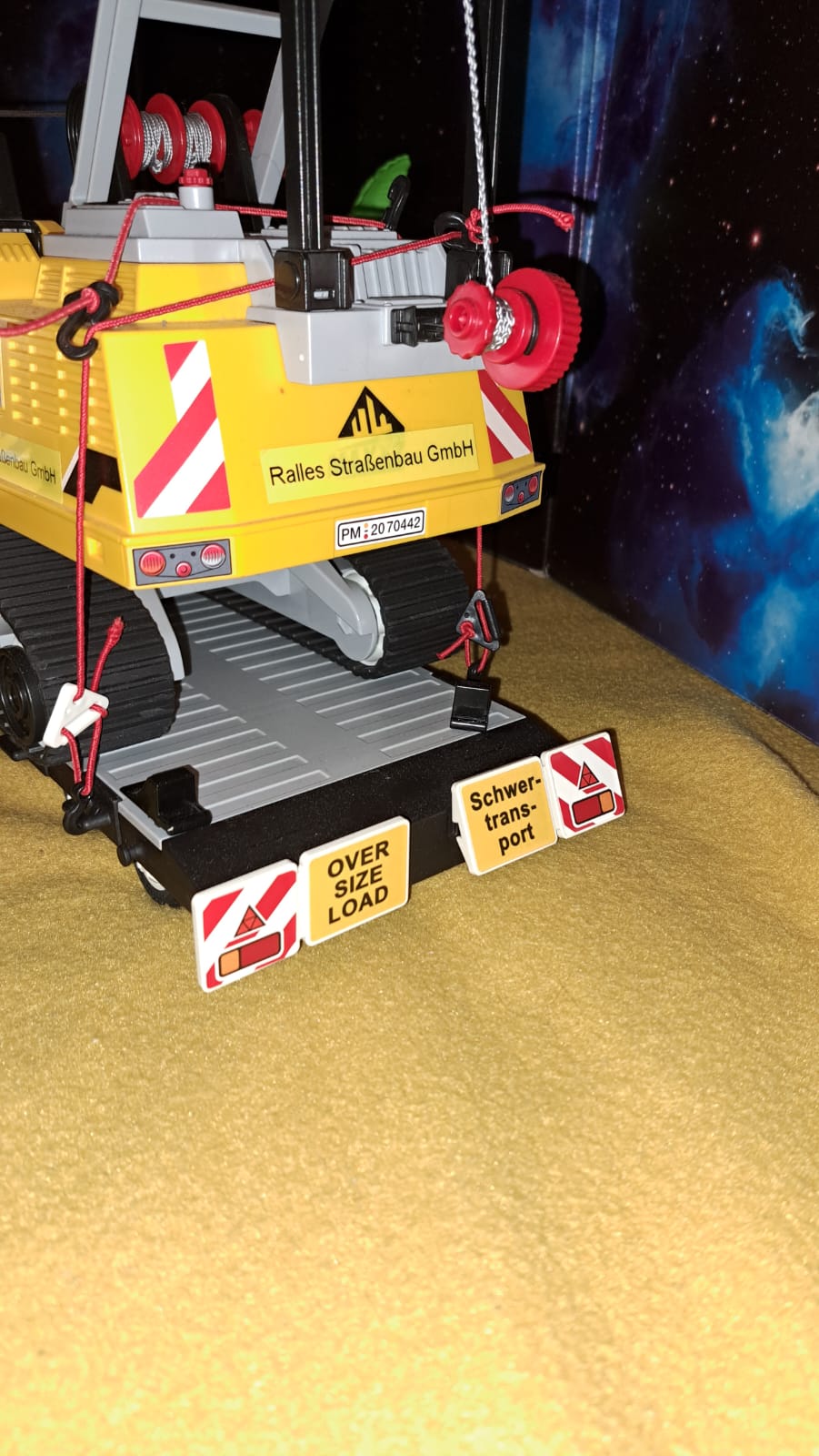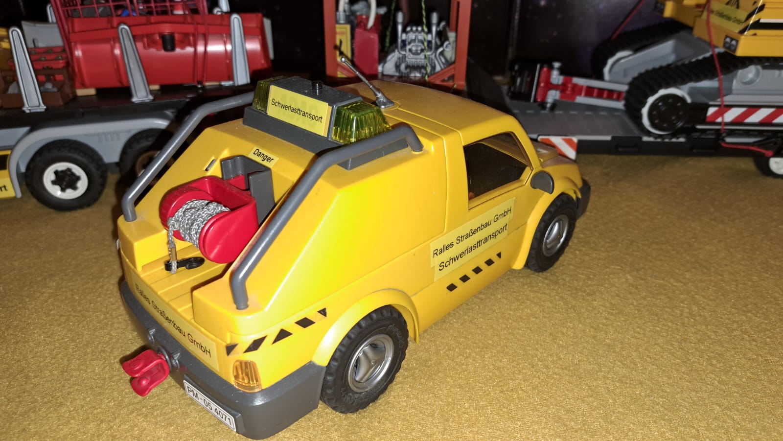 Hier noch mehr Bilder meiner klitzekleinen und bescheidenen Zugmaschine..... den Tiefladeanhänger habe ich von Chris, THWler geschenkt bekommen, aus so was schönen, muss man ja was besonderes Zaubern..... Aufkleber und Warnschilder, Ladung sind von mir.....