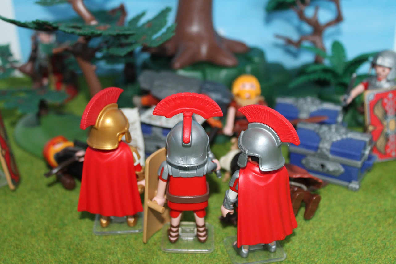 Doch die Freude wirkt nur von kurzer Dauer als ein Tribun eintrifft: "Legat wir haben die flüchtenden Barbaren bis zu einem Eichenhain verfolgt. Dort leisteten sie nochmals erbitterten Widerstand. Kommt bitte mit und seht euch an, was wir dort gefunden haben."