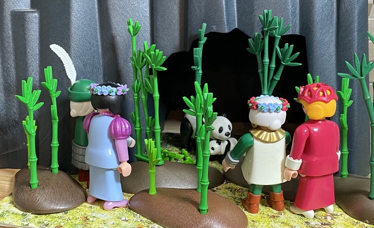Nun bat Guta alle, sie doch zu begleiten, sie wolle ihnen, wie versprochen, die Pandamutter mit ihrem Jungen zeigen. Die Höhle war die nächste zu dem Zwergenhaus und schon bald erreichten sie diese. Vorsichtig lugten sie zwischen dem Bambus hindurch und konnten eine Weile beobachten wie die Bärin ihr niedliches Junges putzte. Was war das für ein entzückender Anblick.