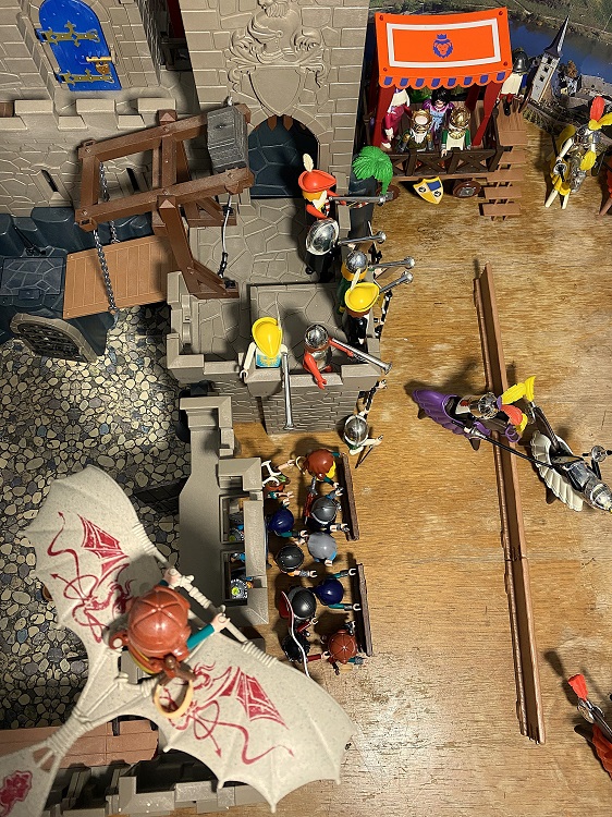 Unterdessen schwebte der Zwerg Gorm in seinem Fluggerät über der Szenerie und beobachtete alles von oben. Der Heidenlärm der Zuschauer drang kaum abgemildert bis zu ihm. Und da! Plötzlich passierte es: dem Drachenritter gelang es endlich seinen Gegner schwungvoll aus dem Sattel zu heben.
