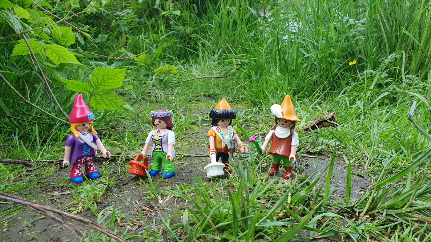 Eine Gruppe Zwergenmädels ist unterwegs, um Blumen für das große Sommerländer Frühlingsfest zu sammeln.